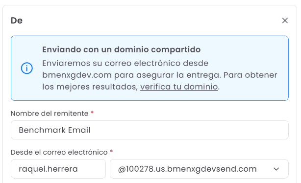 Si no puedes verificar tu dominio o estás usando una dirección de email gratuita (como Gmail, Yahoo u Outlook), tus emails se enviarán desde nuestro dominio compartido, benchmarksend.com . Ten en cuenta que el uso del dominio compartido tiene ciertas limitaciones de cuenta.