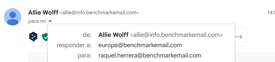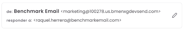 Aunque los destinatarios verán el nombre de tu empresa en el campo De, los proveedores de correo identifican internamente que el remitente real es el dominio de Benchmark durante las comprobaciones de verificación.