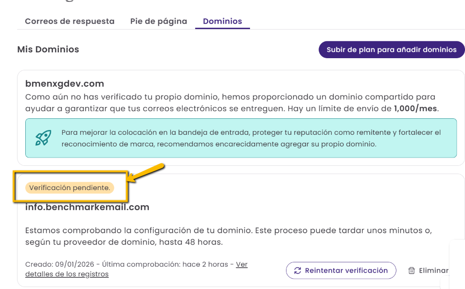 Si has añadido un dominio privado pero aún no lo has verificado, tus emails se enviarán desde el dominio compartido. Puedes comprobar el estado de tu dominio en la pestaña Dominios dentro de Configuración de correo.