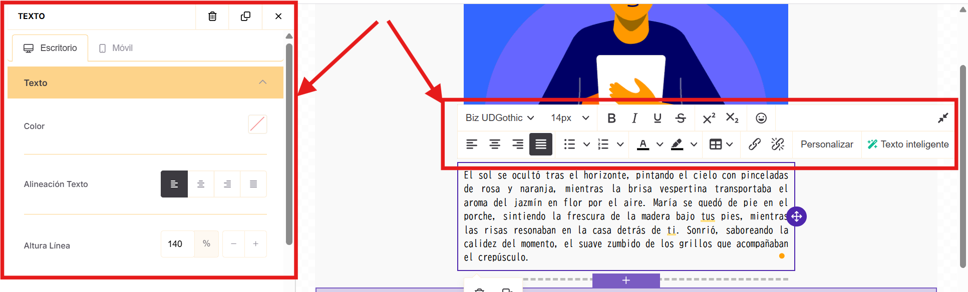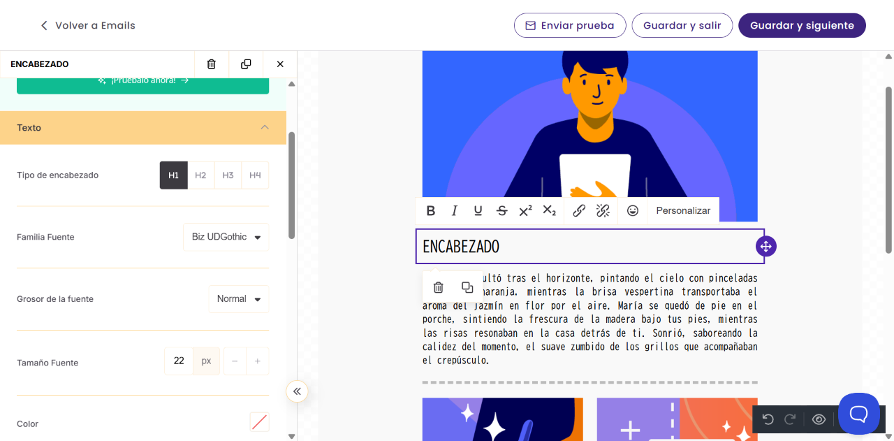 - Definir estilos coherentes en la sección Cuerpo te ahorra tiempo y garantiza una imagen de marca consistente en todo tu mensaje.