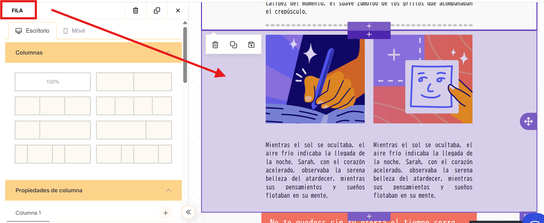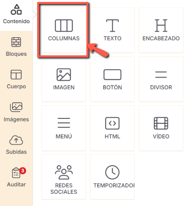 | El elemento Columnas te permite añadir varias columnas dentro del diseño. Una vez creadas, puedes añadir otros elementos (texto, imágenes, botones) en cada columna. |