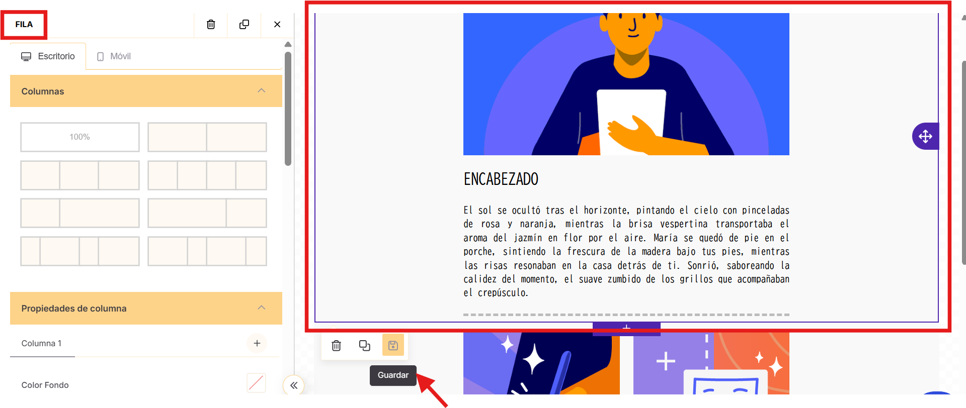 Cada bloque está formado por una o varias columnas. Dentro de ellas puedes añadir distintos elementos de contenido como texto, encabezados, imágenes, botones y más.