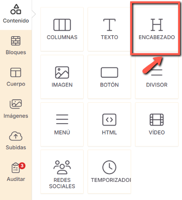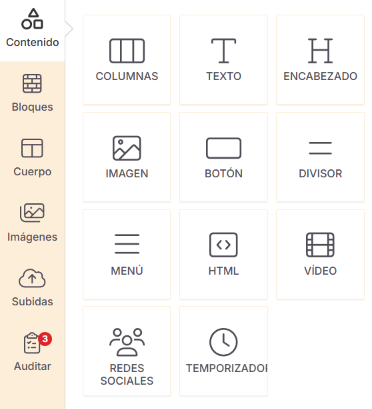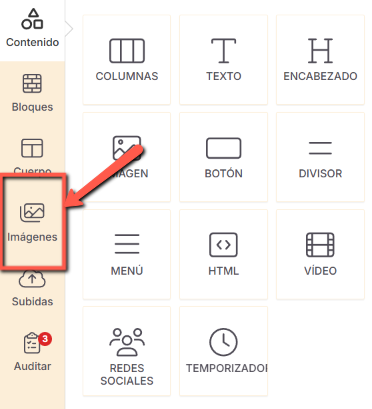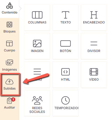 Las opciones Imagen y Subidas están disponibles exclusivamente dentro del editor de emails.