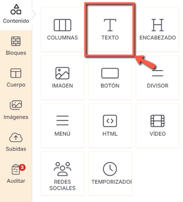 El elemento Texto te permite añadir contenido escrito a tu email. |