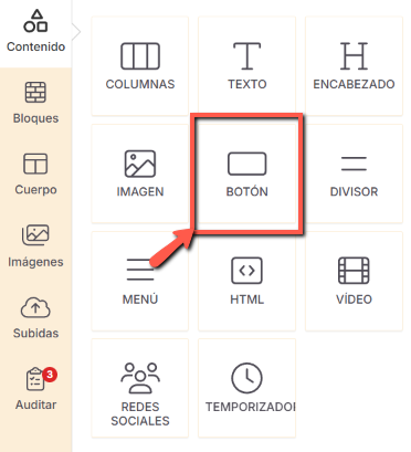 El bloque Botón añade una llamada a la acción clara en tu email. Puedes personalizar texto, enlace, color, tamaño y alineación. El Botón inteligente sugiere textos basados en el contenido del botón o en palabras clave. |