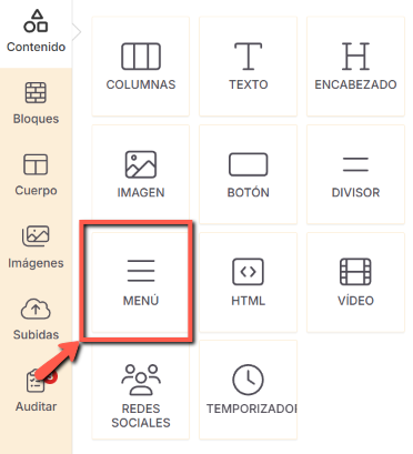 El bloque Menú funciona como una navegación con enlaces clicables. Cada elemento puede dirigir a una web, un número de teléfono, una sección del email o iniciar un email. Puedes personalizar colores, tipografías y diseño desde la pestaña Estilos. |