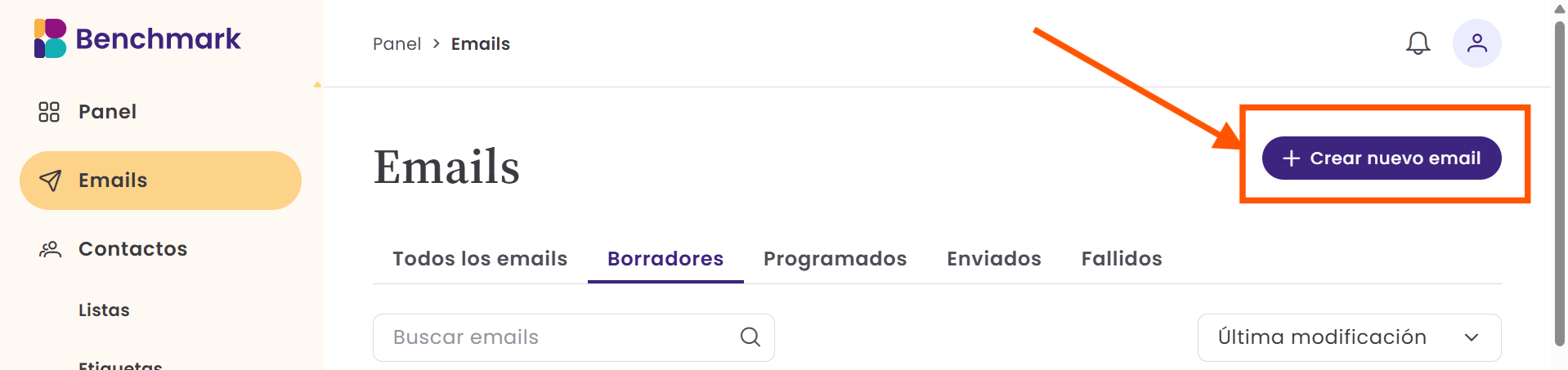 - Desde el panel, haz clic en Emails y selecciona + Crear nuevo email.