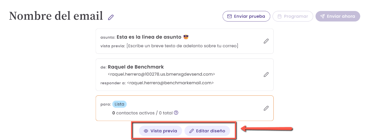 - Enviar prueba: envíate un email de prueba para ver cómo se muestra en la bandeja de entrada.