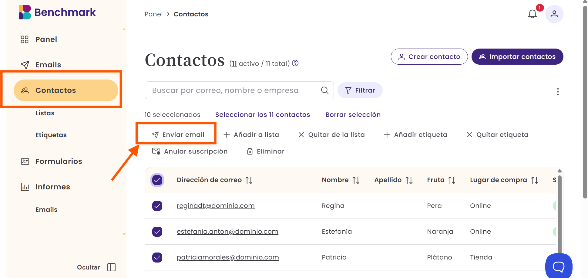 También puedes enviar emails directamente desde la sección de Contactos, seleccionando algunos contactos, todos o aplicando filtros.