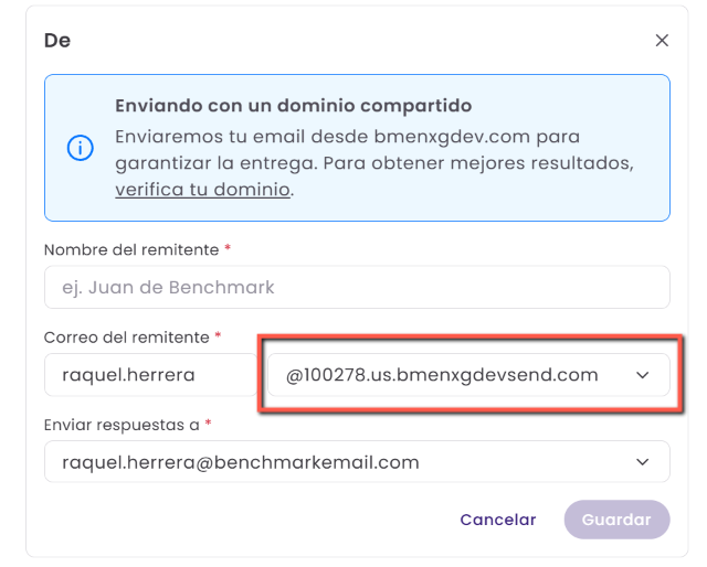 - Si no puedes verificar tu dominio o se produce un error durante la verificación, tus emails se enviarán desde el dominio compartido. En ese caso, la dirección del remitente se mostrará así: