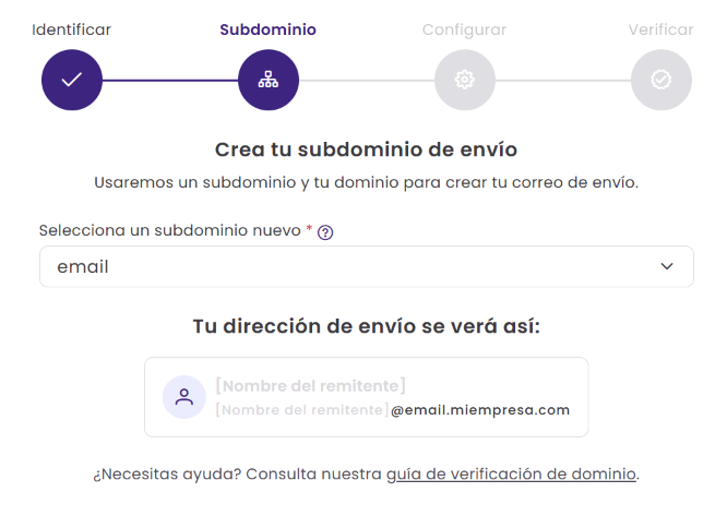 Esta verificación utiliza registros como SPF, DKIM y DMARC. Al añadir un registro NS en tu subdominio, configuramos estos registros automáticamente por ti.