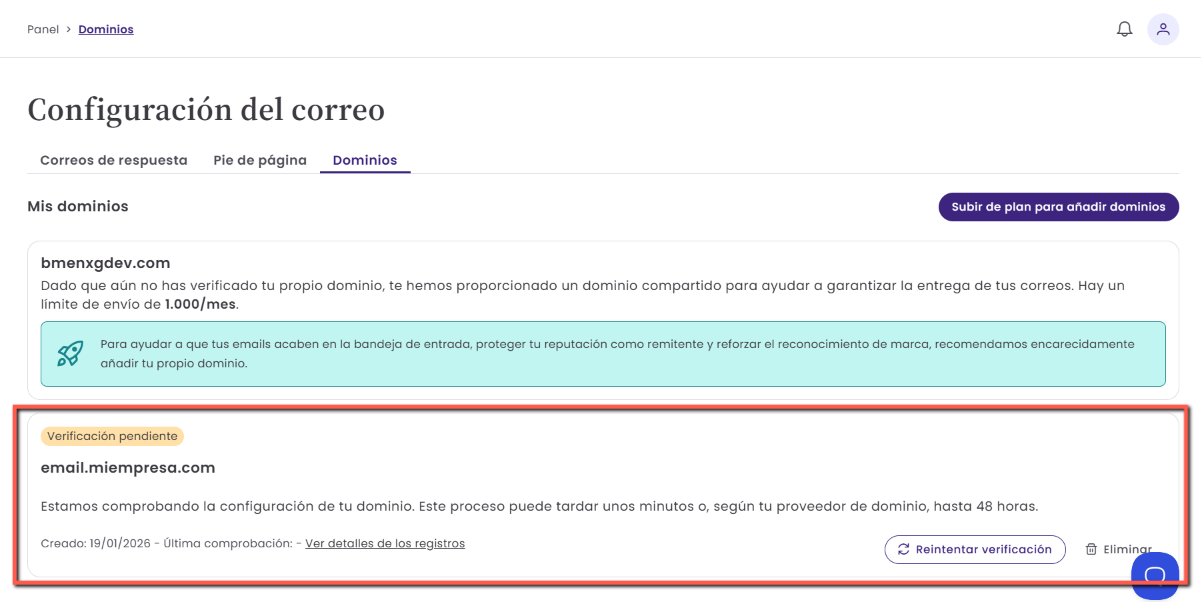Si no se corrige en un plazo de 30 días, el dominio se eliminará automáticamente y tendrás que iniciar el proceso de nuevo. Durante ese tiempo, los emails se enviarán desde el dominio compartido.
