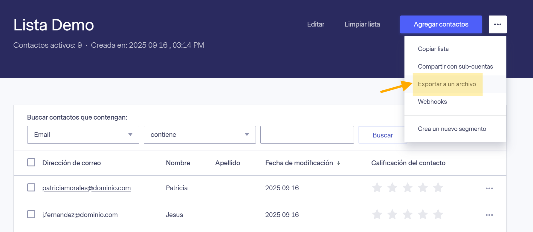 - Ve al Panel de contactos y selecciona la lista que deseas exportar.