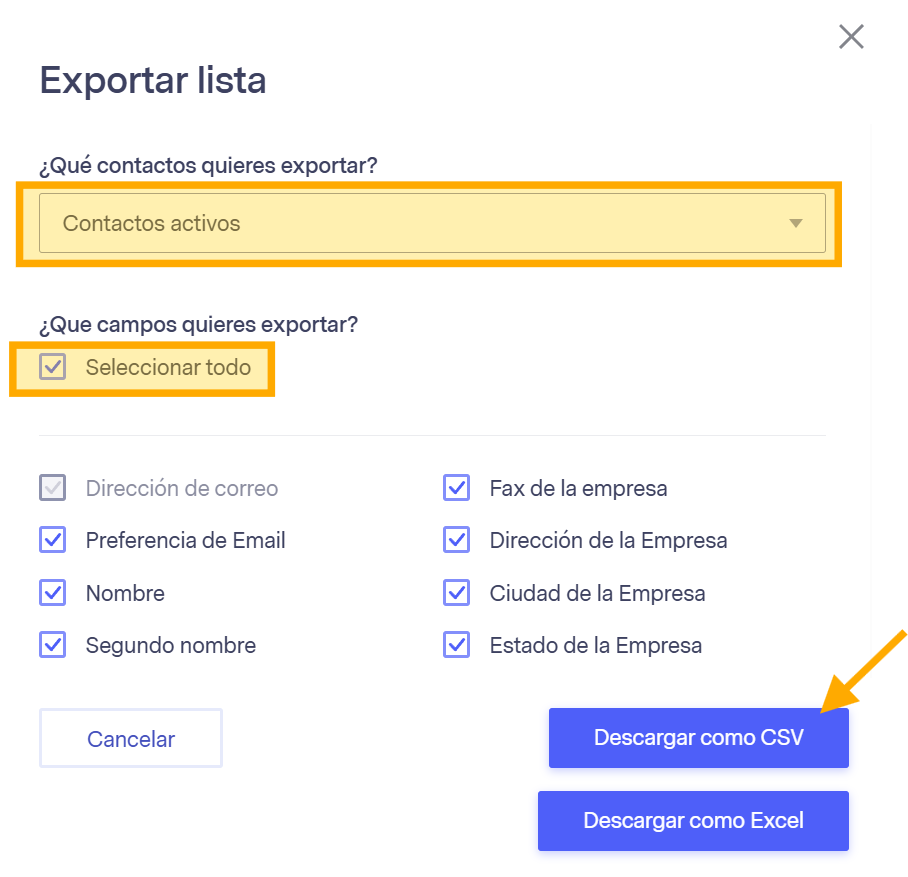 Selecciona los campos que deseas exportar o haz clic en Seleccionar todo para exportar todos los datos.
