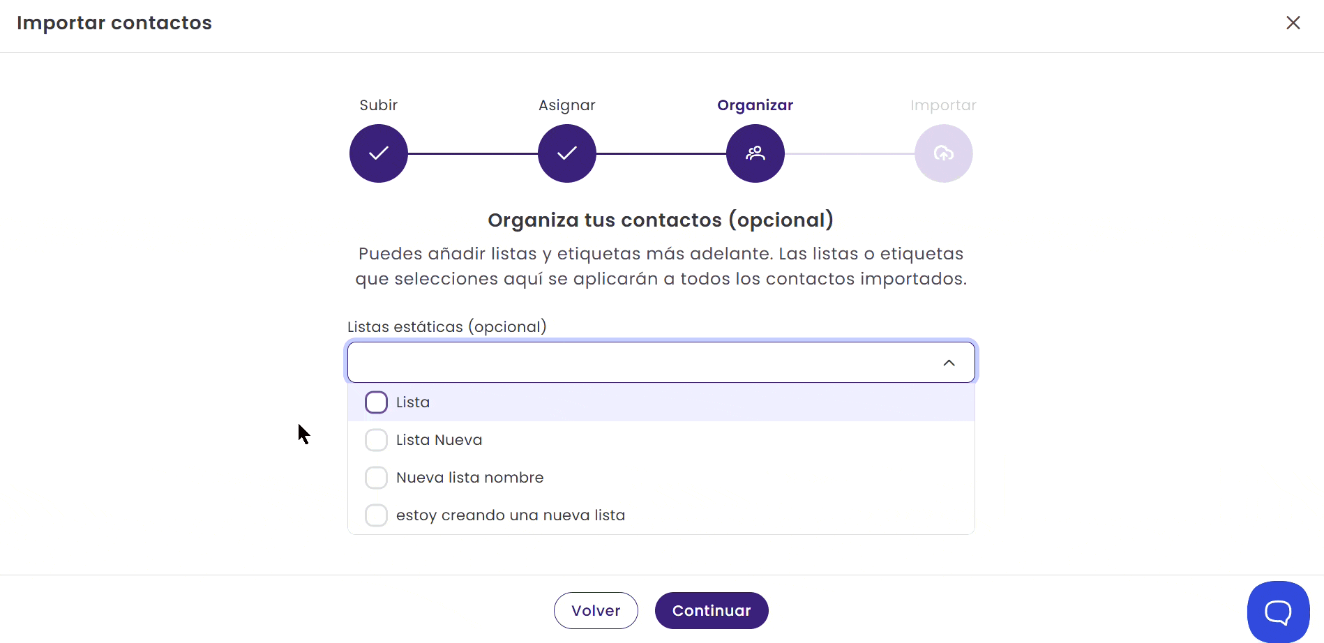 - Nota: no es posible importar contactos desde la sección de Listas.
