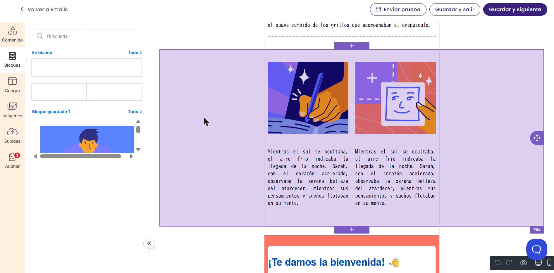 Al igual que en Benchmark Clásico, puedes guardar secciones de tus emails para reutilizarlas más adelante.