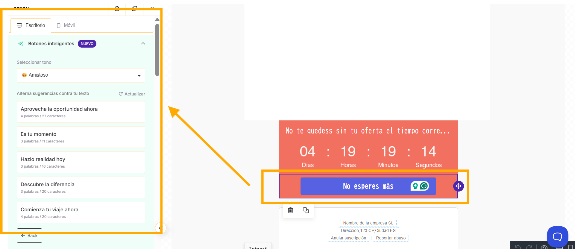 - Botones inteligentes: mejora tus llamadas a la acción o crea nuevas con solo unas indicaciones.