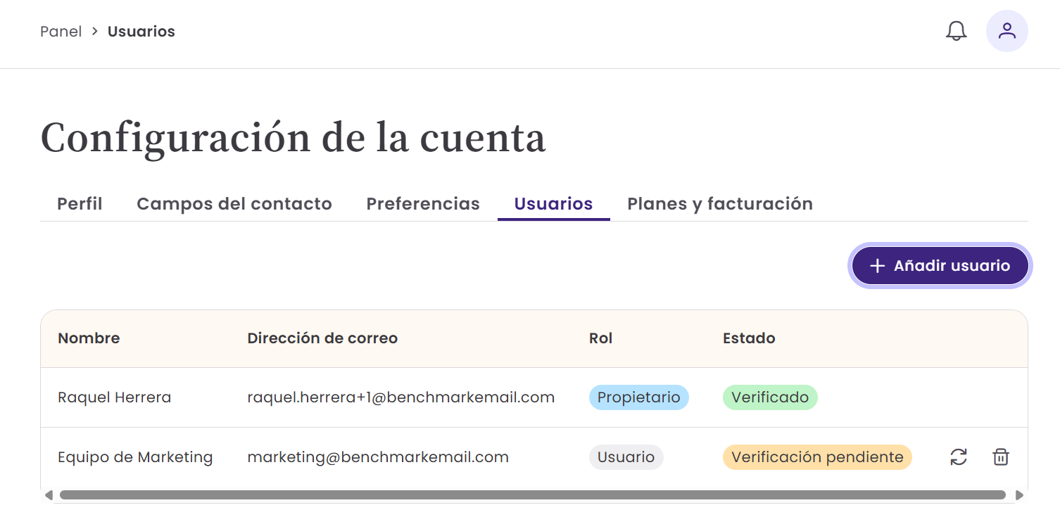 Los usuarios pueden subir contactos, crear y enviar emails, pero no pueden cambiar planes ni gestionar otros usuarios.