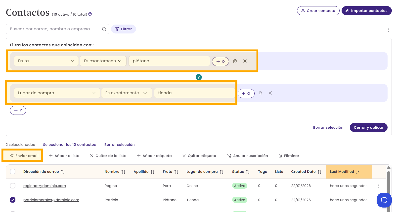 - Filtros por datos de contacto o interacción con emails.