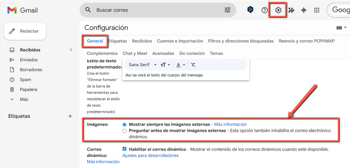 En la configuración de la bandeja de entrada, selecciona la opción “Mostrar siempre las imágenes externas”.