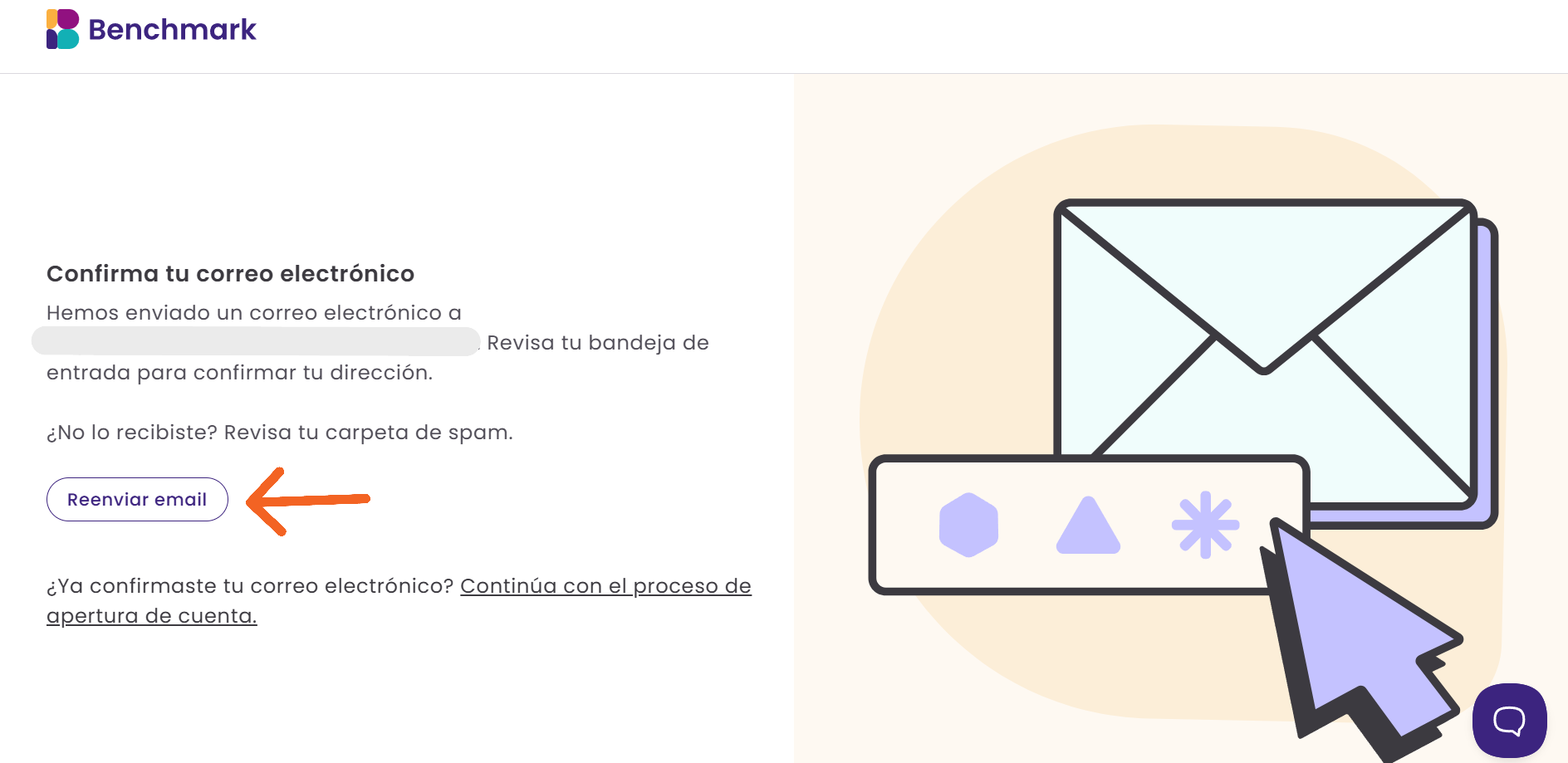- Revisa tu bandeja de entrada, abre nuestro correo y haz clic en el botón “Confirmar mi correo”. El email será enviado desde: no-reply@benchmarkemail.io