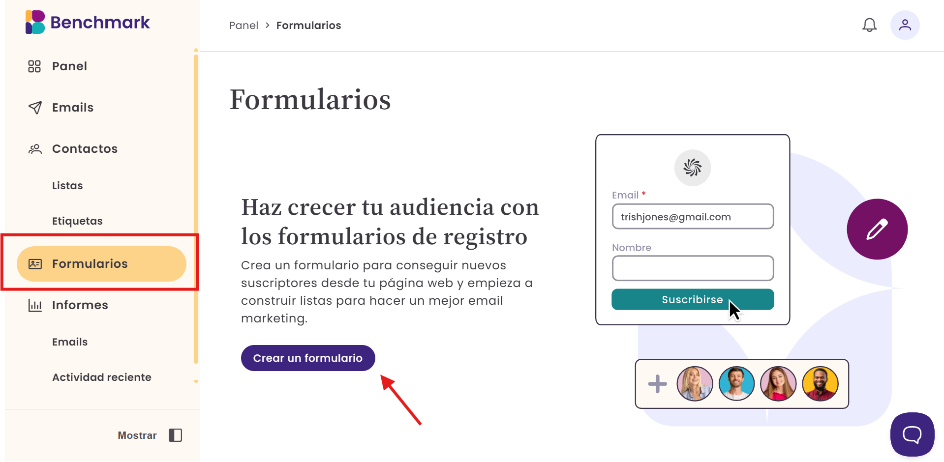 Los Formularios de Benchmark Email te permiten recopilar nuevos suscriptores directamente desde tu sitio web. Los nuevos contactos se añaden automáticamente a tu cuenta y pueden organizarse mediante listas y etiquetas.