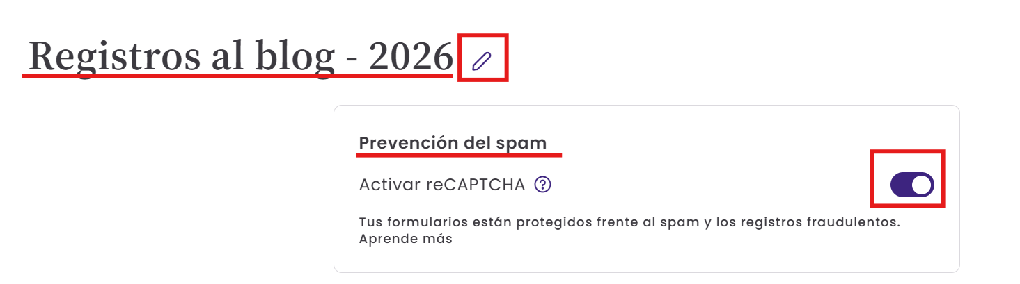Por defecto, reCAPTCHA está activado en todos los formularios nuevos. Esta función ayuda a prevenir registros automatizados por bots. Saber más.