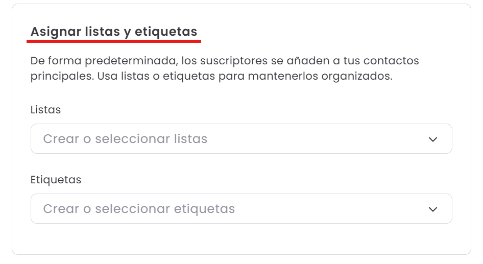 Organiza tus nuevos suscriptores aplicando etiquetas o añadiéndolos a listas específicas. Por defecto, los contactos se añaden a la sección de Contactos.