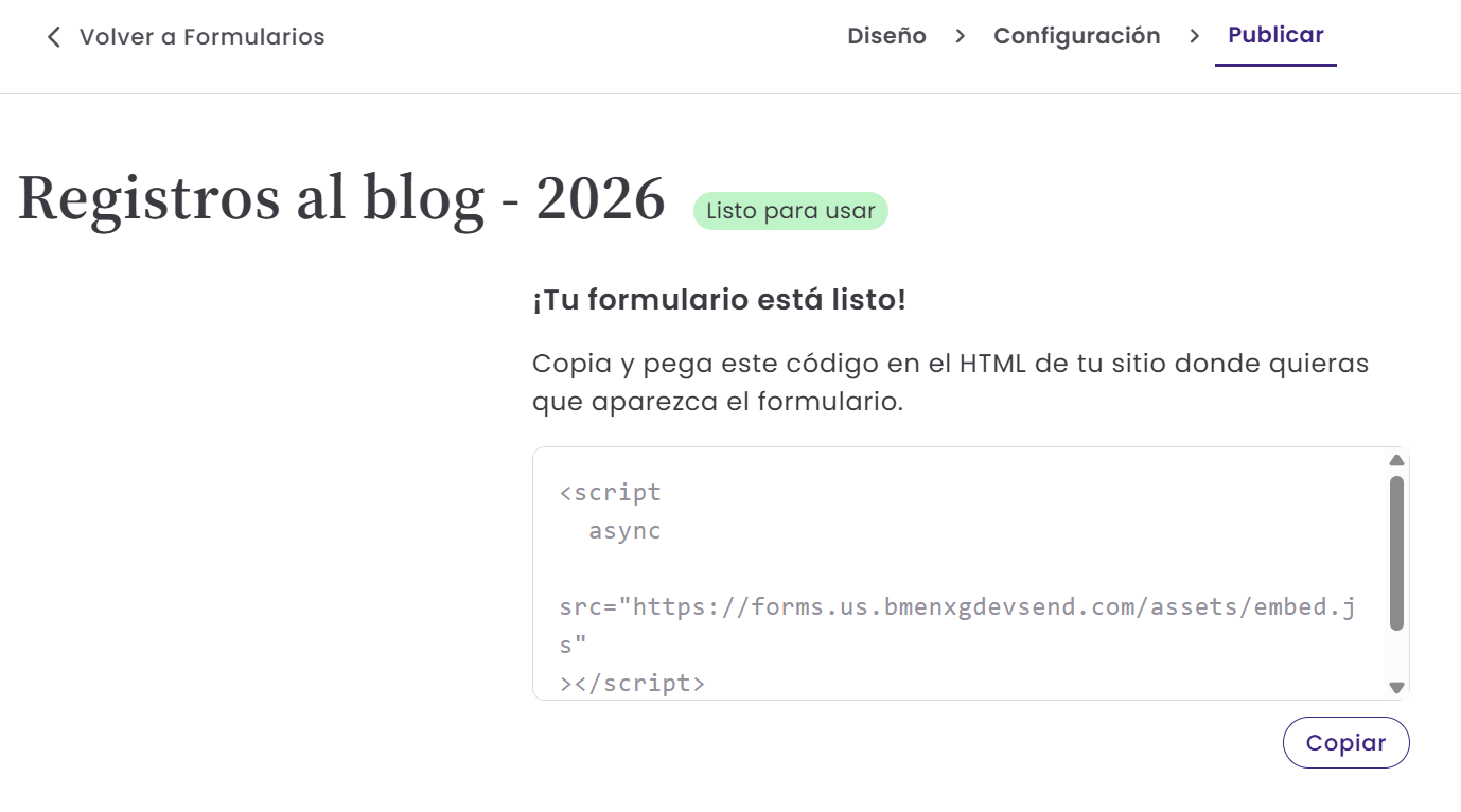 - Los formularios disponibles en la versión de febrero de 2026 son únicamente formularios incrustados (los formularios emergentes o pop-ups no están disponibles actualmente).