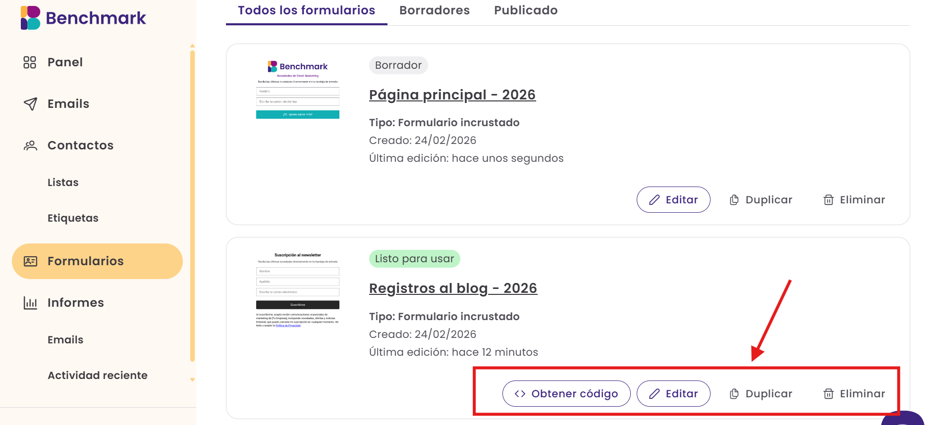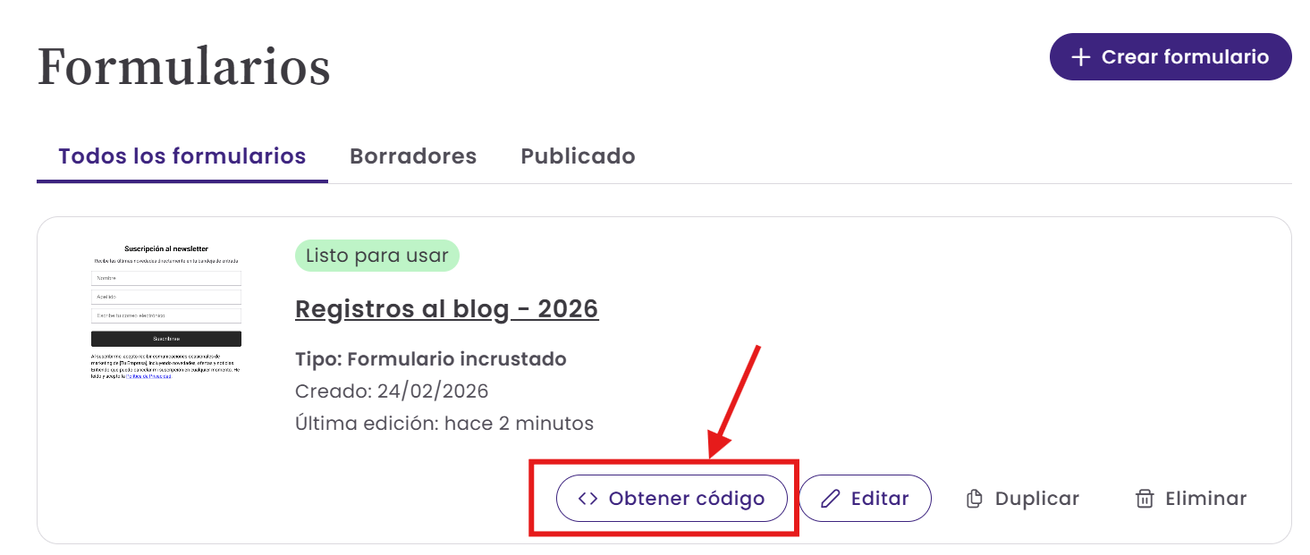 Puedes acceder al código en cualquier momento desde la página de Formularios seleccionando Obtener código.